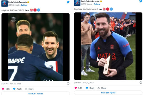 สโมสร ปารีส แซงต์-แชร์กแมง ได้อัพโหลดวิดีโอสุดพิเศษลงบนทวิตเตอร์ เพื่ออวยพรวันเกิดให้กับ ลิโอเนล เมสซี่ เป็นภาพตั้งแต่เจ้าตัวเดินเข้าสู่สโมสรในเมืองหลวงของฝรั่งเศส และมีส่วนสำคัญในการคว้าแชมป์ลีกแดนน้ำหอม 2 ฤดูกาลติด โดยเฉพาะในซีซั่นนี้ที่เจ้าตัวเป็นผู้ทำประตูให้ทีมการันตีคว้าโทรฟี่มาครอบครอง
